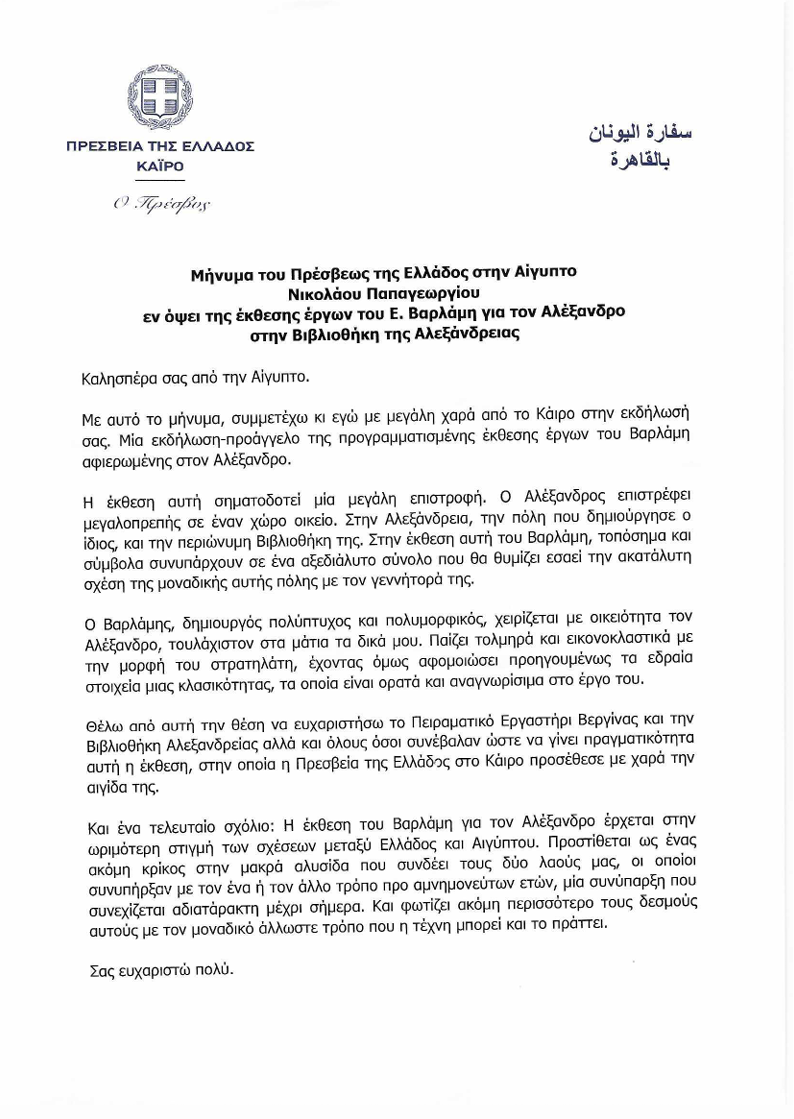 Ο πρέσβης της Ελλάδας στην Αίγυπτο τόνισε πως «η έκθεση σηματοδοτεί μια μεγάλη επιστροφή» και πρόσθεσε: «Ο Αλέξανδρος επιστρέφει μεγαλοπρεπής στην πόλη που δημιούργησε […] Ο Βαρλάμης χειρίζεται με οικειότητα τον Αλέξανδρο, παίζοντας τολμηρά και εικονοπλαστικά με τη μορφή του στρατηλάτη». Σημείωσε ακόμη πως «η έκθεση του Βαρλάμη για τον Μ. Αλέξανδρο έρχεται στην ωριμότερη στιγμή των σχέσεων μεταξύ Ελλάδος και Αιγύπτου και προστίθεται ως ένας ακόμη κρίκος στη μακρά αλυσίδα που συνδέει τους δύο λαούς μας».