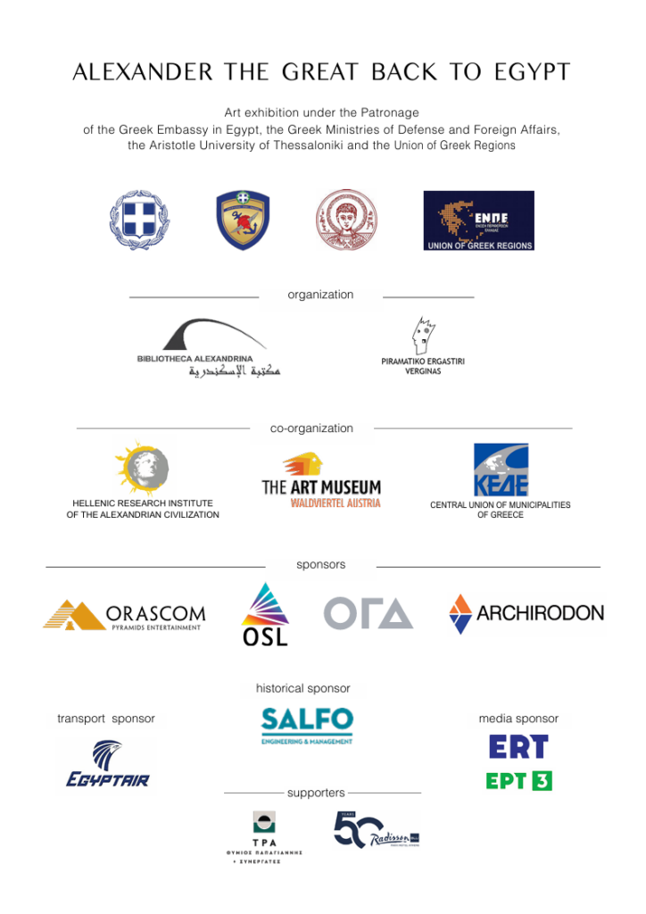 Η έκθεση στην Βιβλιοθήκη της Αλεξάνδρειας τελεί υπό την αιγίδα της Ελληνικής Πρεσβείας στο Κάιρο, των ελληνικών υπουργείων Άμυνας, Εξωτερικών και Εσωτερικών, του ΑΠΘ και της ΕΝΠΕ. Και γίνεται σε συνδιοργάνωση της BIBLIOTHECA ALEXANDRINA, του ΠΕΙΡΑΜΑΤΙΚΟΥ ΕΡΓΑΣΤΗΡΙΟΥ ΒΕΡΓΙΝΑΣ, της ΚΕΔΕ, του Ελληνικού Κέντρου Έρευνας Αλεξανδρινού Πολιτισμού στην Αλεξάνδρεια και του Μουσείου Τέχνης της Αυστρίας.
