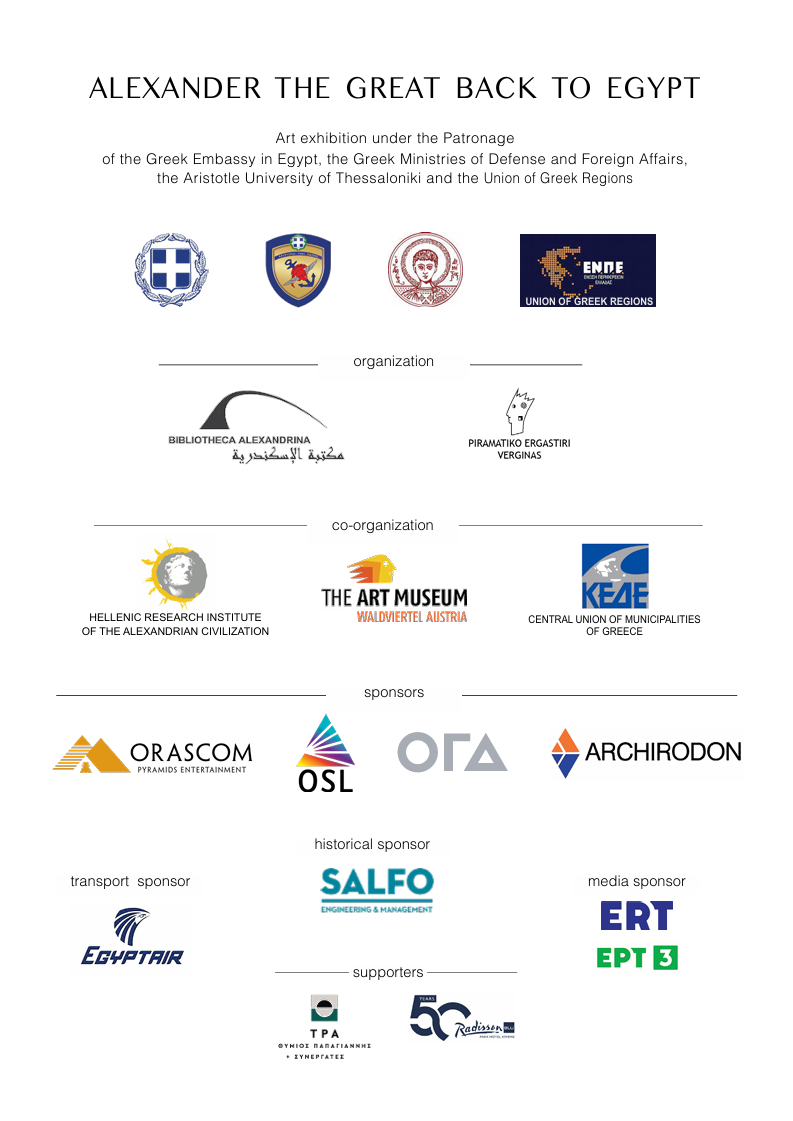 Η έκθεση τελεί υπό την αιγίδα της Ελληνικής Πρεσβείας στην Αίγυπτο, των Υπουργείων Άμυνας, Εξωτερικών, Εσωτερικών (Μακεδονίας-Θράκης), του ΑΠΘ και της Ένωσης Περιφερειών Ελλάδας και είναι συνδιοργάνωση του Ελληνικού Ινστιτούτου Έρευνας Αλεξανδρινού Πολιτισμού, της Κεντρικής Ένωσης Δήμων Ελλάδας, του Μουσείου Τέχνης Waldviertel της Αυστρίας, του Πειραματικού Εργαστηρίου Βεργίνας και της Bibliotheca Alexandrina.
